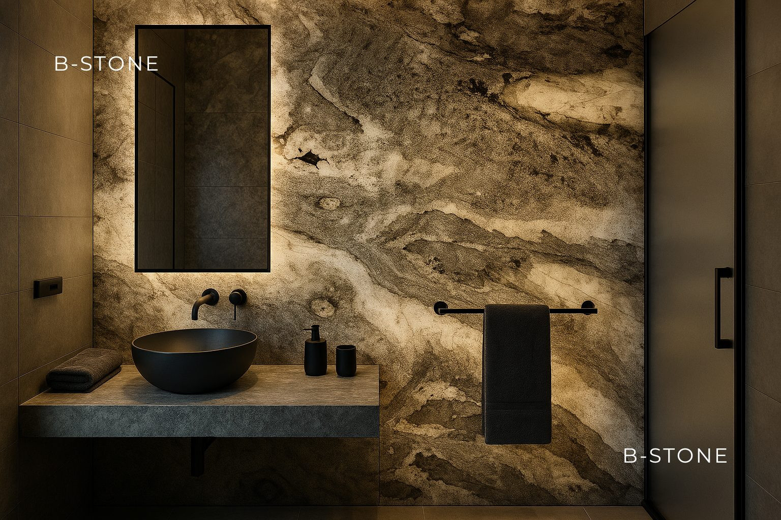 Avec Blackburn 200 Translucide, B-Stone réinvente l’esthétique de la pierre noire en y ajoutant une dimension lumineuse unique. Intense et texturée, cette feuille de pierre naturelle se distingue par sa teinte noir profond et ses motifs organiques.