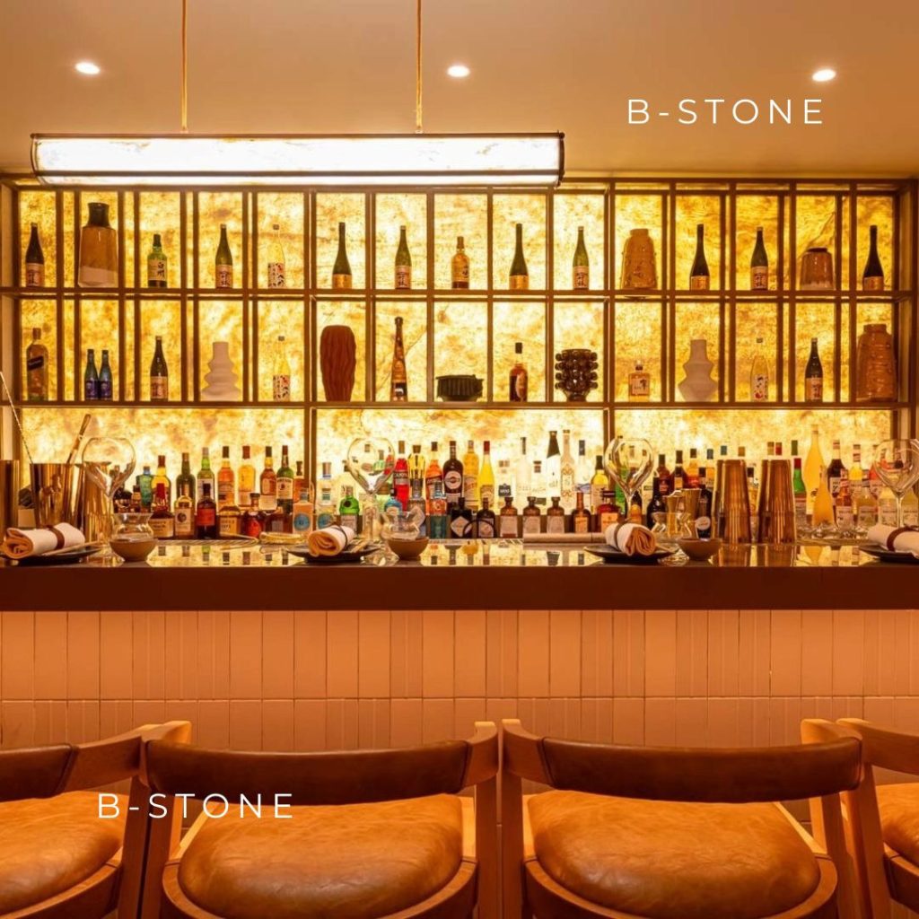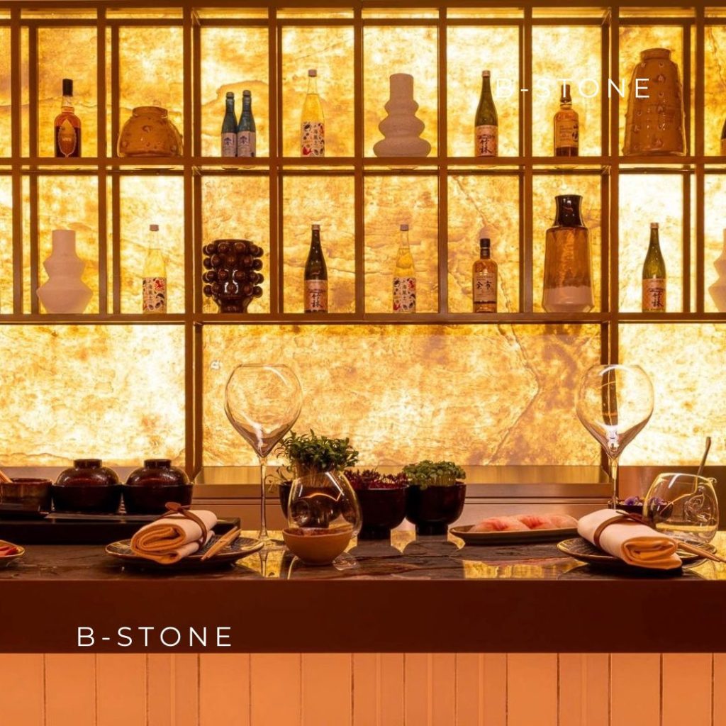 Nous avons apporté une touche élégante et naturelle à l’arrière-bar à sushi avec Mont Blanc 200 translucide, alliant modernité et authenticité ✨.